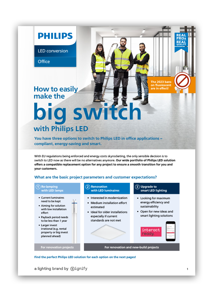 Lataa esite ja katso, mihin kaikkiin valonlähteisiin direktiivi vaikuttaa ja mikä on kunkin poistumisaikataulu ja mitä LED-korvaavuuksia Philipsiltä löytyy.